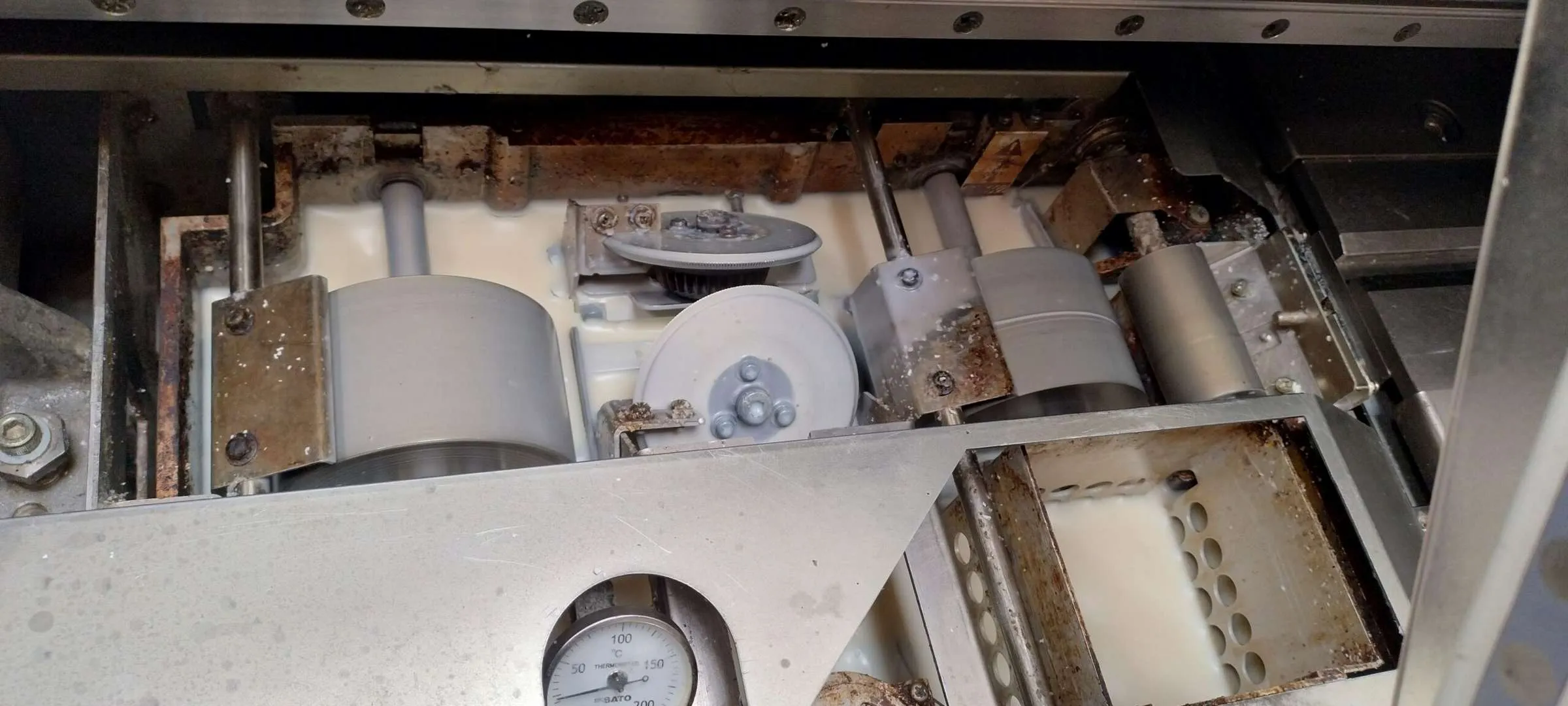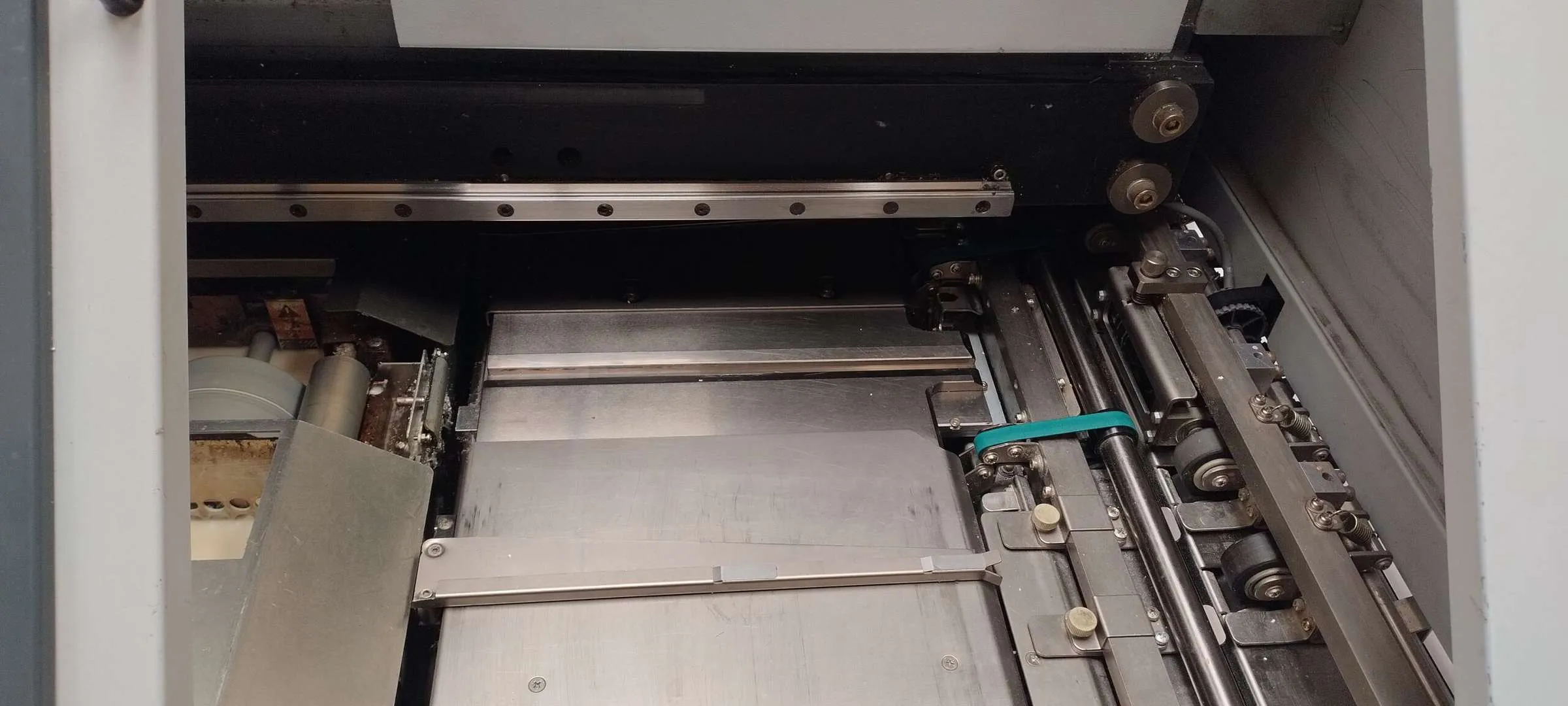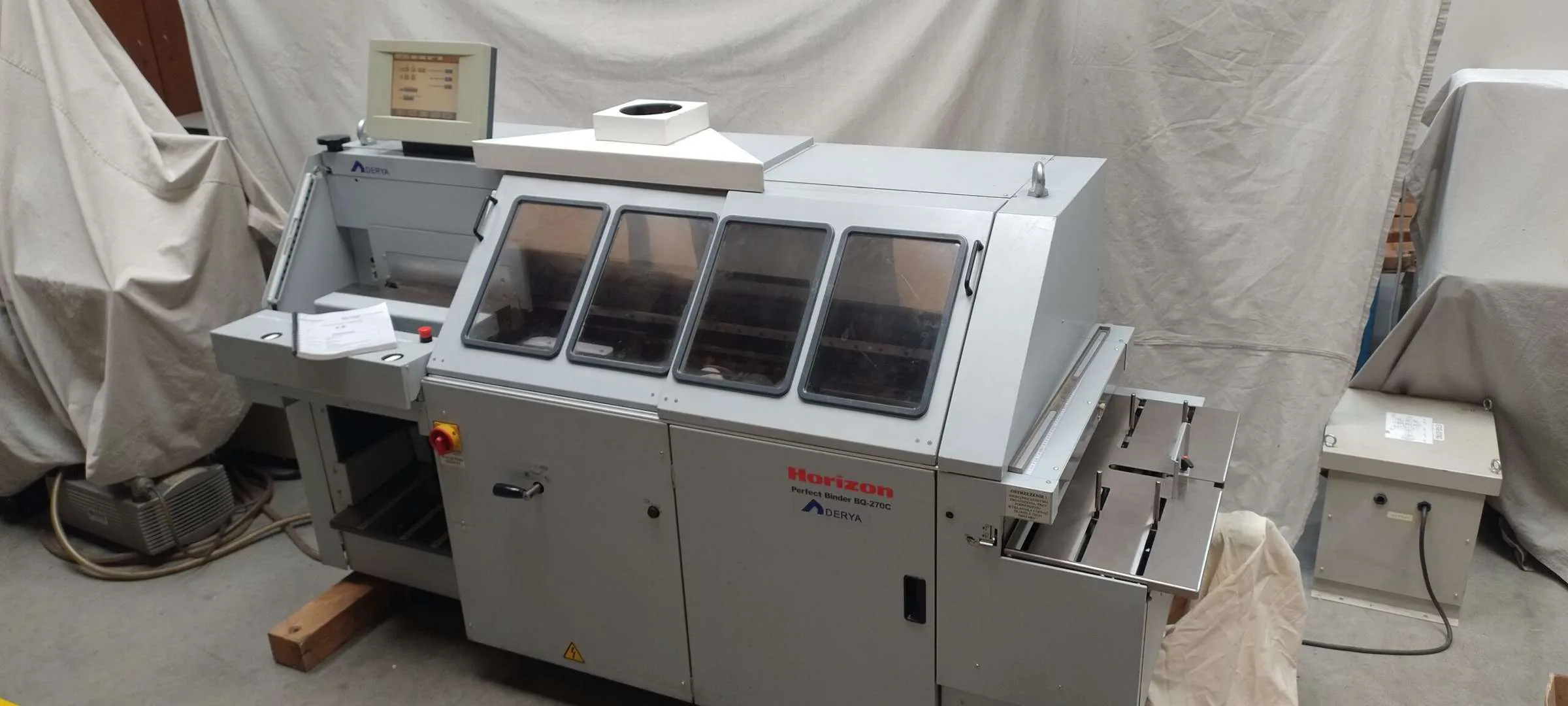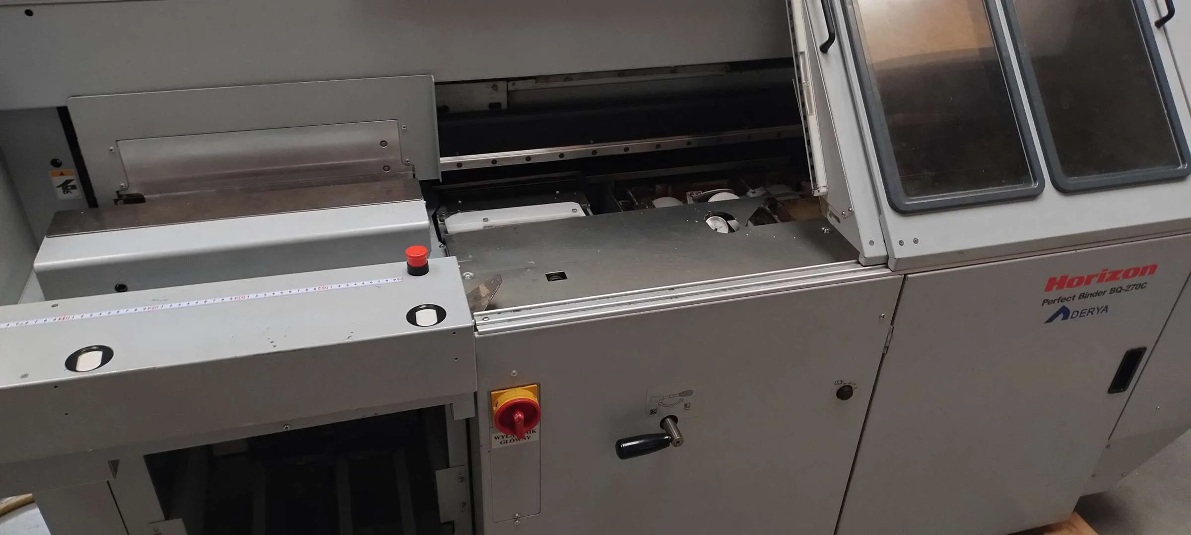 Oklejarka jedno-szczękowa firmy Horizon do oklejania gorącym klejem, w całości ustawiana automatycznie z kolorowego panelu dotykowego. Doskonała jakość od pierwszej książki, przy grubości wkładu od 1 do 50 mm. Wyposażona jest w zespół frezujący z nożykami do nacinania, oraz automatyczne podawanie i bigowanie okładki.